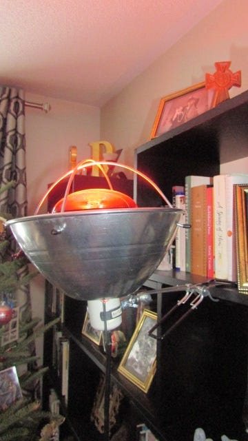 We bought chicken heater lamp clampls, along with red lights (you can get them cheap by GE, or there are more durable brands like Sauna Space). Here’s an example of one of our setups: