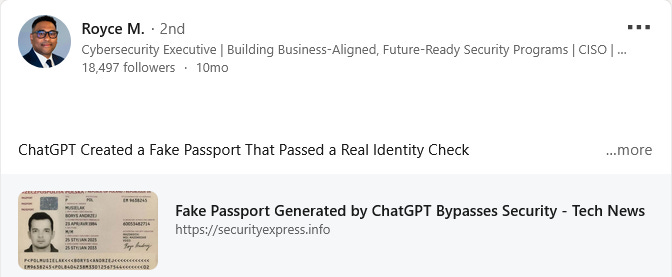 Although the ChatGPT-fabricated passport likely would not withstand scrutiny due to the absence of an embedded chip, it proved sufficient to bypass the most basic KYC (know-your customers) procedures employed by some fintech services like cryptocurrency exchanges. In response, cybersecurity experts are calling for NFC (near field communication), which enable hardware-level authentication.