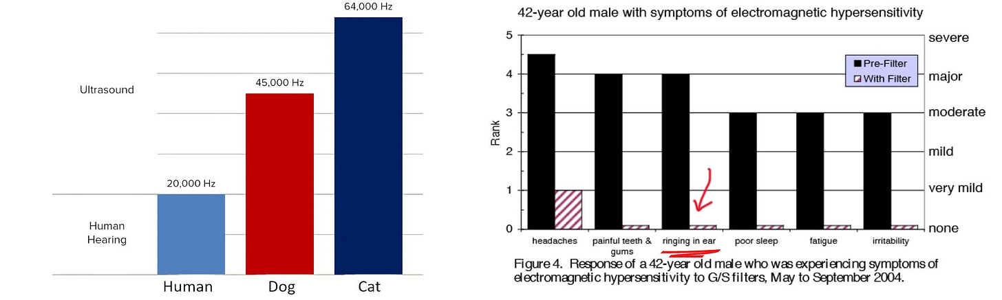 Dogs can also hear in the range of 20 kHz, which is why there have even been accounts of animals not wanting to walk on certain parts of the street with LED streetlights, which also create dirty electricity (kHz frequencies). The higher kHz frequencies produce what are called supraharmonics. Not all of us hear this noise, yet it affects us all. Some may experience supraharmonics as tinnitus.
