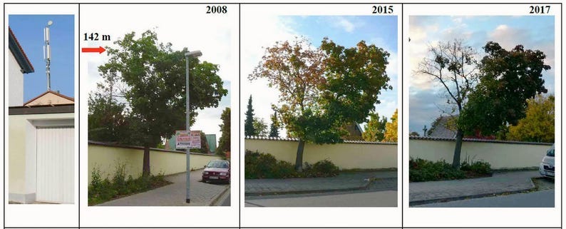 Our electromagnetic weather forecast can be predicted from trees, by observing their first line of defense - their leaves. Shrubs and trees placed next to smart meters will wither and wilt, as radiofrequency (RF) dehydrates and distorts the surrounding light environment. A detailed long-term field monitoring study was performed in Germany, which found1 a high level of damage to trees from RF radiation. Pests, other diseases, and root damage were all ruled out.